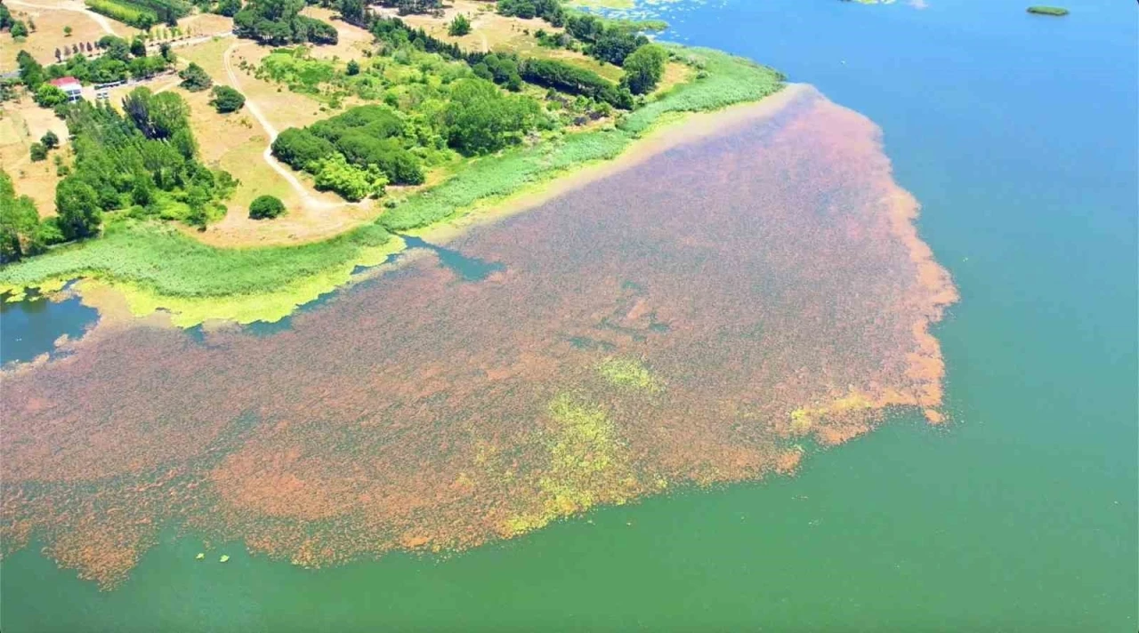 Durugöl olarak da bilinen Terkos Gölü’nün İstanbul’un Arnavutköy ilçesinde kalan kısmında, ilkbaharla birlikte yüzeye yayılan yeşil renkli bitkiler görsel şölen sundu. Bitkilerin renk değişimi, gölün yüzenin bazı kesimlerini pembeye dönüştürdü. Dronla görüntülenen göldeki güzel manzara dronla havadan görüntülendi.