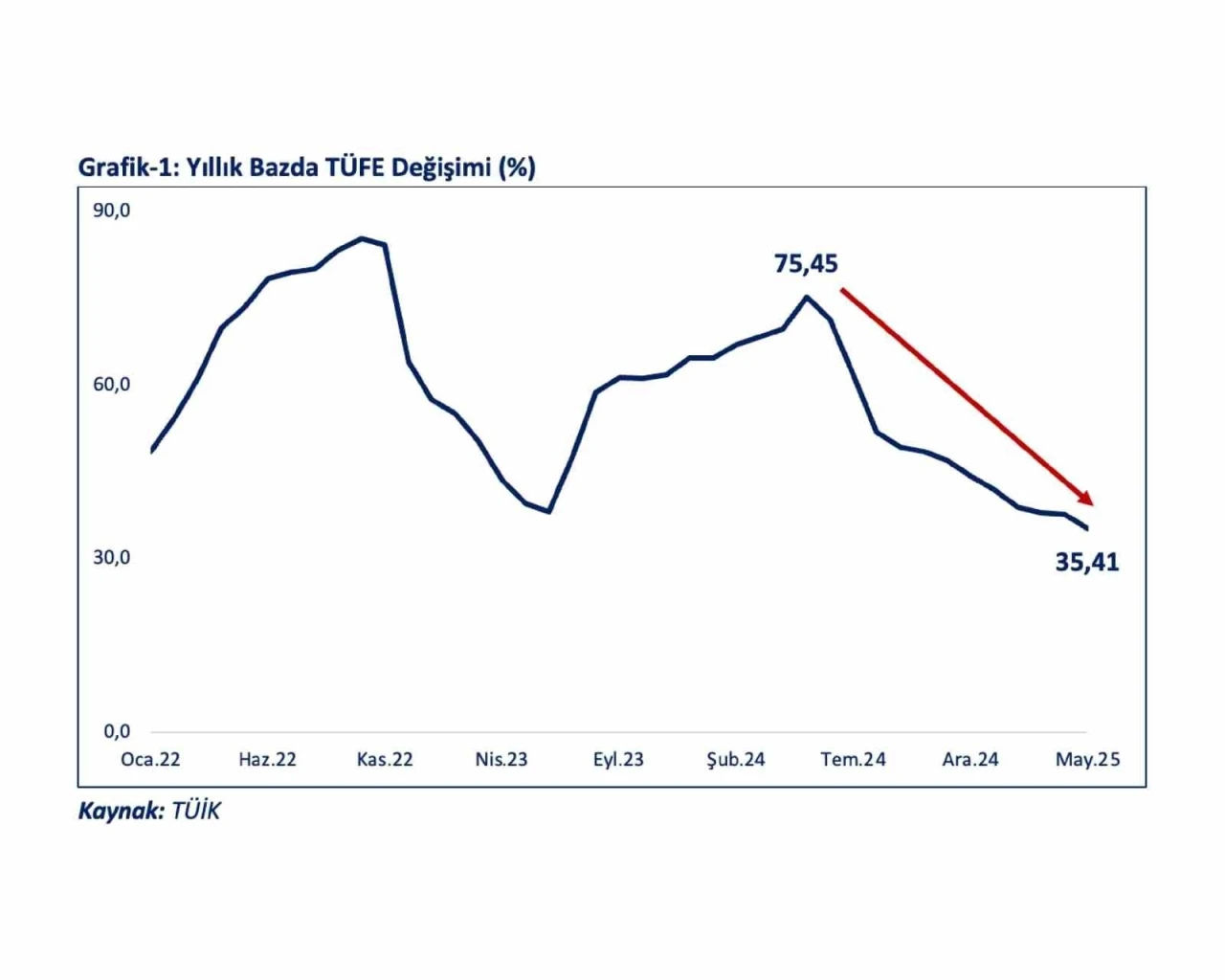 "Bunun sonucunda 2024 Mayıs ayına kıyasla enflasyon son 12 ayda 40,0 puan üzerinde gerilemiştir. Yİ-ÜFE’deki (2003=100) değişim 2025 yılı Mayıs ayında bir önceki aya göre yüzde 2,48 olarak gerçekleşmiş, böylece yıllık enflasyon yüzde 23,13 olarak gerçekleşmiştir. Çekirdek TÜFE C endeksinde (enerji, gıda ve içecekler ile tütün ürünleri ve altın hariç, TÜFE) yıllık enflasyon bir önceki aya göre yüzde 2,43 olarak gerçeklemiş yıllık enflasyon ise yüzde 35,37 olmuştur. Fiyat katılığının yüksek olduğu hizmetler grubunda yıllık enflasyon bir önceki aya göre 3,4 puan gerileyerek yaklaşık son 35 ayın en düşük seviyesi olan yüzde 51,2 olmuştur." "2025 yılının ilk beş ayında kümülatif enflasyon yüzde 15,09 olmuştur"