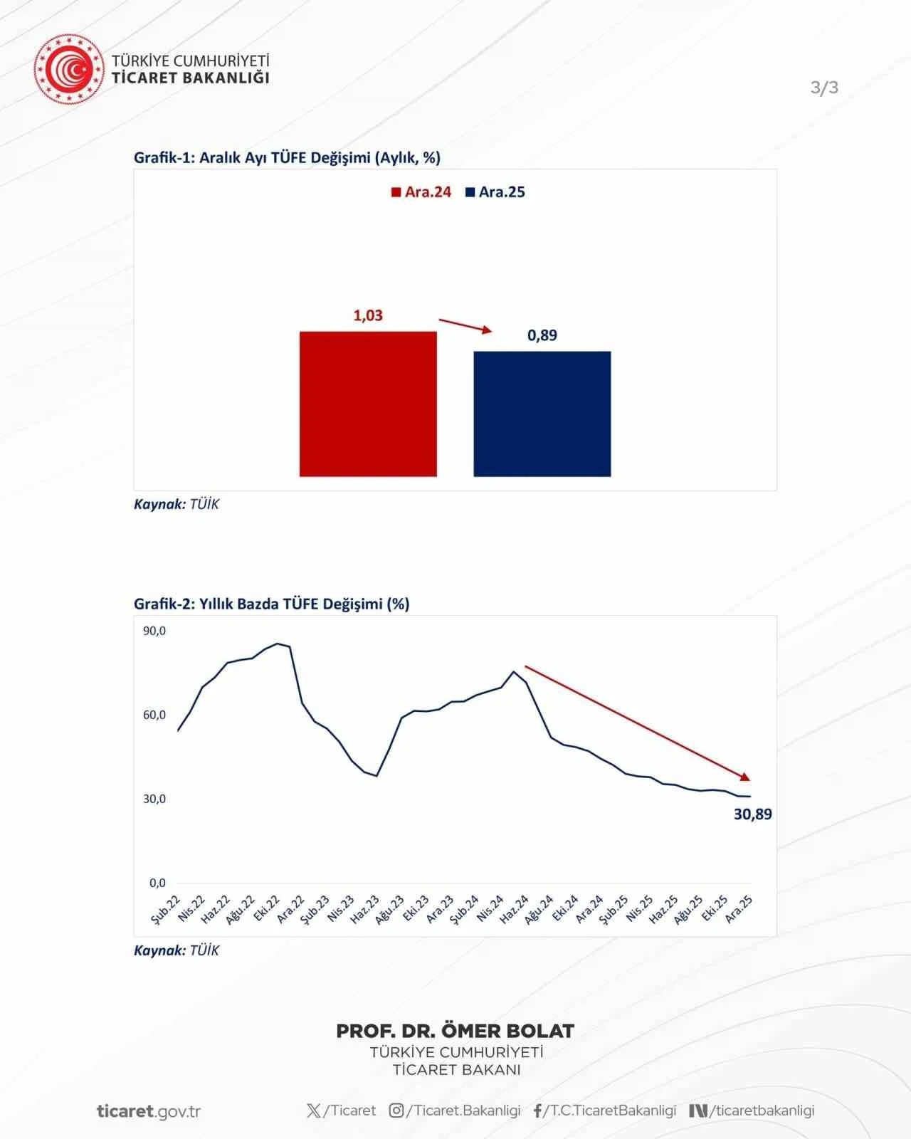 Bolat, Aralık ayında enflasyonda önemli bir düşüş görüldüğünü belirterek "2025 yılı Aralık ayında aylık enflasyon yüzde 0,89 olarak gerçekleşti. Böylece yıllık enflasyon Aralık ayında yüzde 30,89’a geriledi" dedi. "Yıllık enflasyon son 49 ayın en düşük seviyesinde"