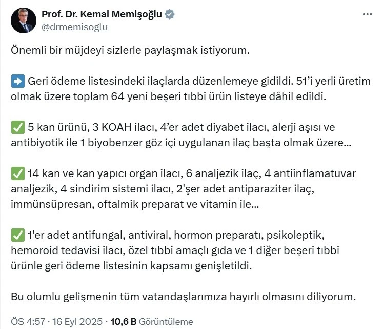 "Önemli bir müjdeyi sizlerle paylaşmak istiyorum. Geri ödeme listesindeki ilaçlarda düzenlemeye gidildi. 51’i yerli üretim olmak üzere toplam 64 yeni beşeri tıbbi ürün listeye dâhil edildi. 5 kan ürünü, 3 KOAH ilacı, 4’er adet diyabet ilacı, alerji aşısı ve antibiyotik ile 1 biyobenzer göz içi uygulanan ilaç başta olmak üzere, 14 kan ve kan yapıcı organ ilacı, 6 analjezik ilaç, 4 antiinflamatuvar analjezik, 4 sindirim sistemi ilacı, 2’şer adet antiparaziter ilaç, immünsüpresan, oftalmik preparat ve vitamin ile 1’er adet antifungal, antiviral, hormon preparatı, psikoleptik, hemoroid tedavisi ilacı, özel tıbbi amaçlı gıda ve 1 diğer beşeri tıbbi ürünle geri ödeme listesinin kapsamı genişletildi. Bu olumlu gelişmenin tüm vatandaşlarımıza hayırlı olmasını diliyorum."