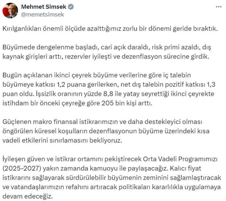 Bakan Şimşek, ekonomik gidişata ilişkin açıklamalarda bulundu. Kırılganlıkların önemli ölçüde azaltıldığı zorlu bir dönemin geride bırakıldığını belirten Bakan Şimşek, “Büyümede dengelenme başladı, cari açık daraldı, risk primi azaldı, dış kaynak girişleri arttı, rezervler iyileşti ve dezenflasyon sürecine girdik. Bugün açıklanan ikinci çeyrek büyüme verilerine göre iç talebin büyümeye katkısı 1,2 puana gerilerken, net dış talebin pozitif katkısı 1,3 puan oldu. İşsizlik oranının yüzde 8,8 ile yatay seyrettiği ikinci çeyrekte istihdam bir önceki çeyreğe göre 205 bin kişi arttı. Güçlenen makro finansal istikrarımızın ve daha destekleyici olması öngörülen küresel şartların dezenflasyonun büyüme üzerindeki kısa vadeli etkilerini sınırlamasını bekliyoruz. İyileşen güven ve istikrar ortamını pekiştirecek Orta Vadeli Programımızı (2025-2027) yakın zamanda kamuoyu ile paylaşacağız. Kalıcı fiyat istikrarını sağlayarak sürdürülebilir büyümenin zeminini sağlamlaştıracak ve vatandaşlarımızın refahını artıracak politikaları kararlılıkla uygulamaya devam edeceğiz” ifadelerini kullandı.