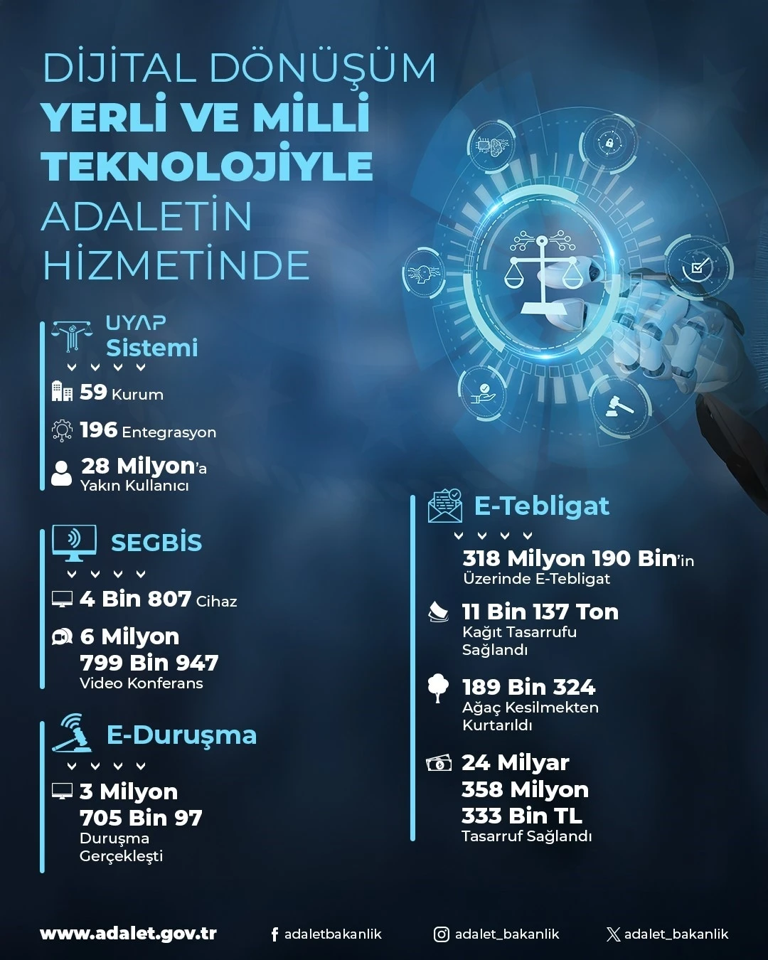 "Kendi kaynaklarımızla, yerli ve milli imkanlarımızla hayata geçirdiğimiz proje ve uygulamalarla zaman ve mekan sınırlarını ortadan kaldırıyoruz. Böylece işlemleri daha da hızlandırırken kaynaklardan ve masraflardan sağladığımız tasarrufla ülke ekonomisine katkıda bulunuyoruz. Dünyaya örnek olan ve 24’ü uluslararası olmak üzere toplam 47 ödüle layık görülen Ulusal Yargı Ağı Projesi (UYAP) ile yargı hizmetlerini teknolojik gelişmelerle güçlendirdik ve bilişim alanında tarihi bir dönüşüme imza attık. UYAP sistemini hayata geçirdiğimiz 2007 yılından günümüze kadar toplam 59 kurum ve kuruluş ile 196 entegrasyon gerçekleştirdik. Bilgi ve belgelerin saniyeler içerisinde temin edilebildiği UYAP’ta; vatandaş portalı 24,6 milyon, avukat portalı 209 bin, uzlaştırmacı portalı 19 bin, bilirkişi portalı 83 bin, arabulucu portalı 48 bin, e-satış portalı 3 milyon kullanıcıya ulaştı. Uygulamaya koyduğumuz Sesli ve Görüntülü Bilişim Sistemleri (SEGBİS), tutuklu ile hükümlülerin duruşma salonlarına getirilmesinin, vatandaşlarımızın ifade vermek için uzaktaki mahkemeye gitmesinin önüne geçtik. SEGBİS’in kullanılmaya başlanıldığı 2013 yılından bugüne kadar kurulumunu tamamladığımız 4 bin 807 adet cihaz ile 6 milyon 799 bin 947 video konferans görüşmesi yapılmasını sağladık. Hukuk mahkemesi yargılamalarında tarafların ve avukatların mahkeme salonuna gitmeden çevrimiçi katıldığı e-duruşma sistemiyle ise 15 Eylül 2020 tarihinden itibaren 3 milyon 705 bin 97 duruşma gerçekleştirdik. E-tebligat sistemiyle haftalarca süren tebligat işlemini, saniyeler içerisinde gerçekleştirilebilir hale getirdik. Böyle yargı süreçlerini hızlandırırken doğamızın yok olmasının önüne geçtik. 2015 yılından günümüze 318 milyon 190 binin üzerinde e-tebligat göndererek; 11 bin 137 ton kağıt tasarrufu sağladık, 189 bin 324 ağacı kesilmekten kurtardık, 24 milyar 358 milyon 333 bin lira tasarruf ettik." "Yapay zekaya dayalı uygulamalar geliştireceğiz"