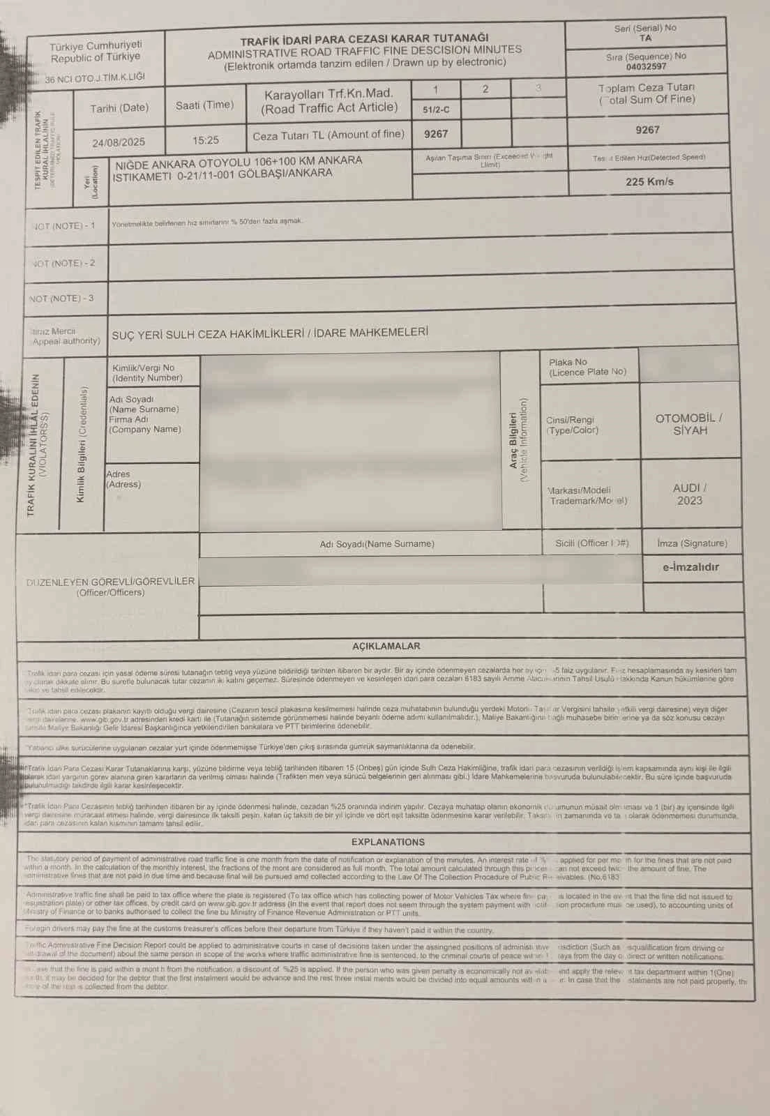 Ulaştırma ve Altyapı Bakanı Abdulkadir Uraloğlu Ankara-Niğde Otoyolu’nda araç kullandığı anları sosyal medya hesabından paylaştı. Uraloğlu’nun paylaşımında aracın saate 225 kilometre hıza çıkmasının ardından Uraloğlu’na otoyol jandarması tarafından radar cezası uygulandı. Bakan Uraloğlu radar cezası aldığını açıkladığı paylaşımda, "Ankara - Niğde Otoyolu’nun son durumunu görmek amacıyla direksiyona geçtim. Bu esnada farkında olmadan hız sınırını kısa bir süre de olsa aştım. İlgili video ile de kendimi ihbar etmiş oldum. Hız sınırlarına riayet etmek herkes için zorunlu bir durumdur. Otoyol Jandarmamız tarafından gerekli cezai işlem de uygulanmıştır. Bundan sonra çok daha dikkatli davranacağımı kamuoyunun bilgisine sunarım" ifadelerine yer verdi. Bakan Uraloğlu’na "hız sınırını yüzde 50’den fazla aşmak" maddesinden 9 bin 267 lira ceza kesildi.