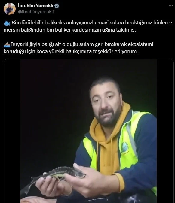 Yumaklı paylaşımında, "Sürdürülebilir balıkçılık anlayışımızla mavi sulara bıraktığımız binlerce Mersin balığından biri, balıkçı kardeşimizin ağına takılmış. Duyarlılığıyla balığı ait olduğu sulara geri bırakarak ekosistemi koruduğu için koca yürekli balıkçımıza teşekkür ediyorum" ifadelerine yer verdi.