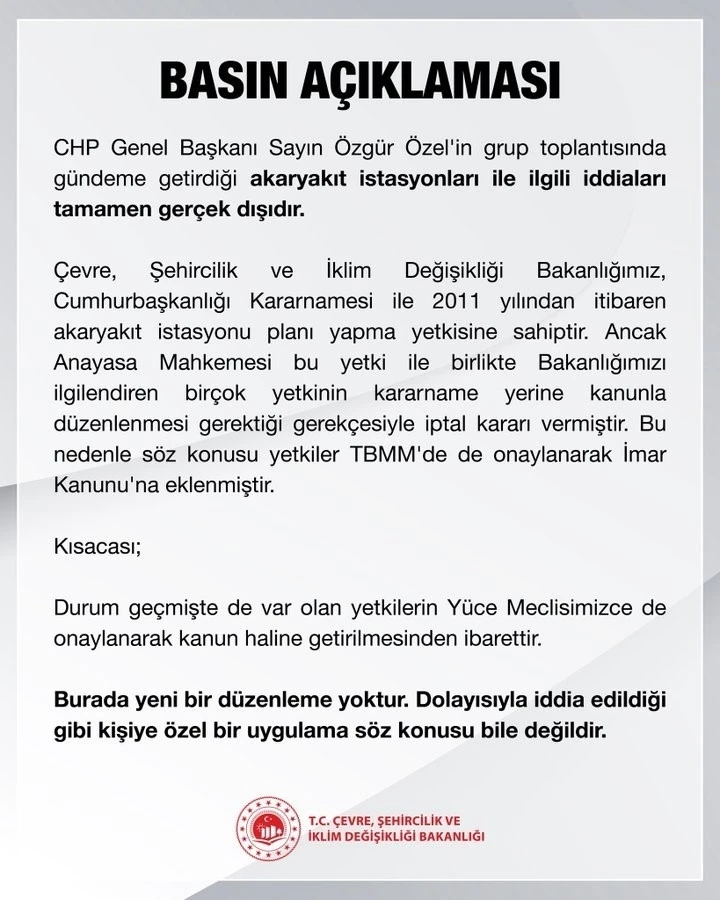 Çevre, Şehircilik ve İklim Değişikliği Bakanlığı, CHP Genel Başkanı Özgür Özel’in grup toplantısında gündeme getirdiği akaryakıt istasyonları ile ilgili iddialarının tamamen gerçek dışı olduğunu duyurdu.