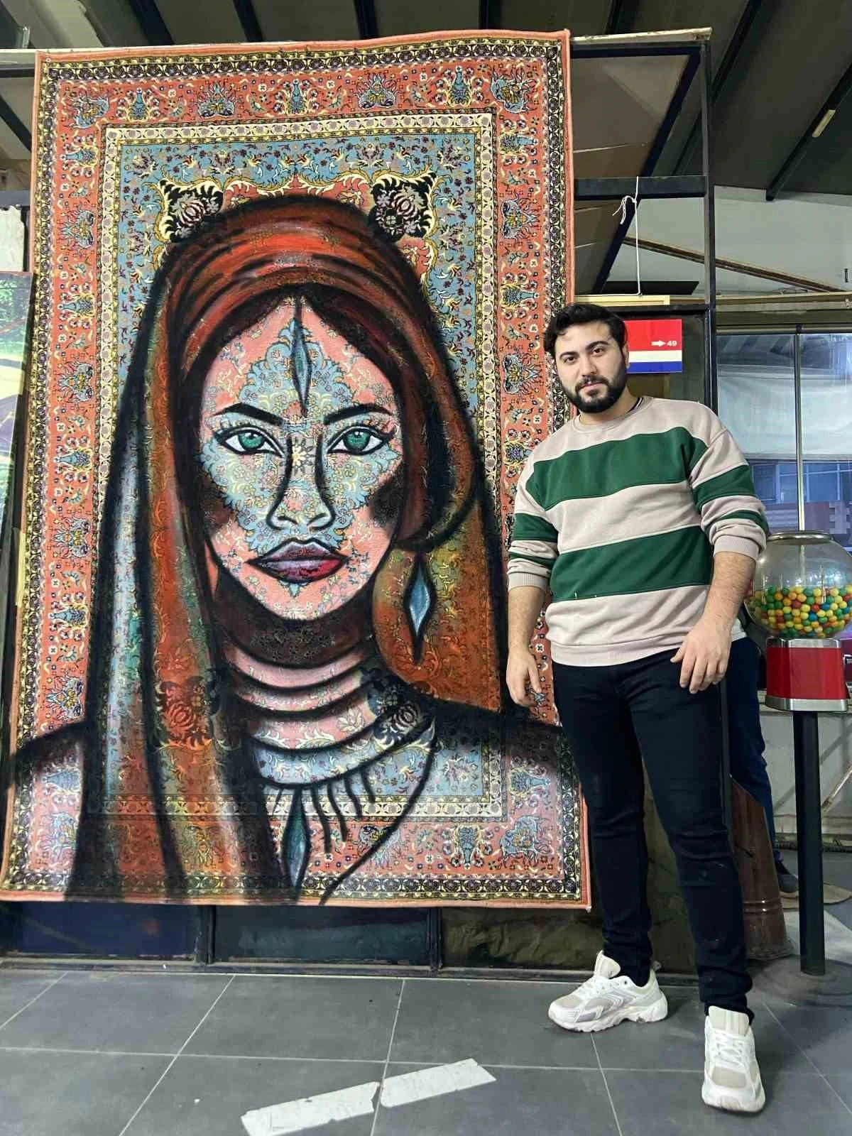Dövme sanatçısı Erdinç Engin (32), kahve işletmecisi Erkan Yılan’ın sosyal medyada görüp beğendiği bir kadın figürünü halıya resmetti. Yılan’ın bin 500 liraya satın aldığı halı, Engin’in dokunuşuyla sanatsal bir esere dönüştü. Sprey boya ile yapılan bu çalışma, halının orijinal motifleriyle modern çizgileri buluşturarak mistik ve etkileyici bir görünüm kazandırdı.