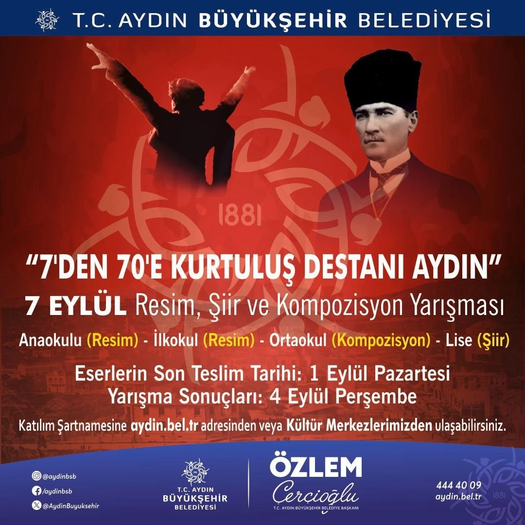 Aydın Büyükşehir Belediye Başkanı Özlem Çerçioğlu, Aydın’ın düşman işgalinden kurtuluşunun yıldönümünde ’7’den 70’e Kurtuluş Destanı Aydın’ temalı ödüllü resim, şiir ve kompozisyon yarışmasıyla öğrencileri coşkuya ortak olmaya davet ediyor. Gençlerin sanata yönelmesini teşvik eden Aydın Büyükşehir Belediyesi, bu anlamlı yarışmayla farklı yaş gruplarındaki öğrencilerin yeteneklerini ortaya koymasına fırsat sunacak. Resim kategorisinde anaokulu ve ilkokul, kompozisyon kategorisinde ortaokul, şiir kategorisinde ise lise öğrencileri yarışacak. Eserlerin son teslim tarihi 1 Eylül Pazartesi günü mesai bitimi olarak belirlendi. Başvurular Vali Yazıcıoğlu Kültür Merkezi’ne elden ya da kargoyla yapılabilecek. Yarışma sonuçları 4 Eylül’de www.aydın.bel.tr adresinden açıklanacak. Başkan Çerçioğlu, tüm gençleri yarışmaya katılarak Aydın’ın düşman işgalinden kurtuluşunun yıldönümünün coşkusunu yaşamaya davet etti.