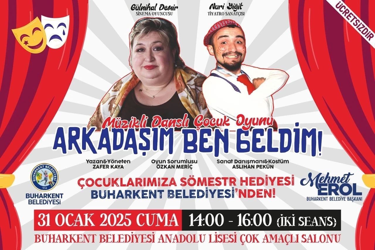 Çocuklara sömestr hediyesi amacıyla tiyatro oyunu gerçekleştirdiklerini belirten Buharkent Belediye Başkanı Mehmet Erol; "Zafer Kaya’nın yazıp yönettiği ve Muğlalı ünlü oyuncu Gülnihal Demir’in sahne alacağı oyun 31 Ocak 2025 Cuma günü Buharkent Belediyesi Anadolu Lisesi Çok Amaçlı Salonunda sergilenecek. Aynı gün 14.00 ve 16.00 saatlerinde iki seans oynanacak ’Arkadaşım Ben Geldim’ oyununa tüm öğrencilerimizi davet ediyoruz" dedi.