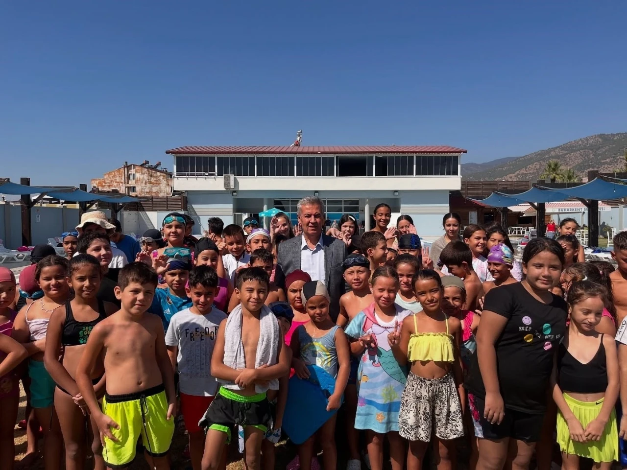 Aydın’ın Buharkent ilçesinde belediye tarafından verilen yüzme kurslarında 260 çocuk eğitimlerini tamamlarken, sertifikalarını Belediye Başkanı Mehmet Erol takdim etti.