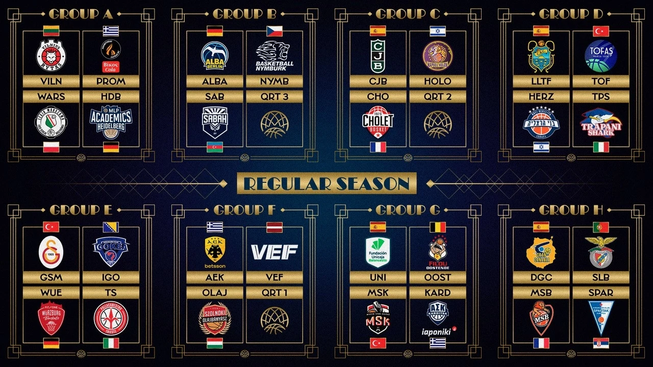 Galatasaray; Igokea m:tel, FIT/One Würzburg Baskets ve Pallacanestro Trieste ile birlikte E Grubu’nda yer aldı. Mersin Spor da G Grubu’nda Unicaja, Filou Oostende ve Karditsa Iaponiki ile eşleşti. Tofaş ise D Grubu’nda La Laguna Tenerife, Bnei Penlink Herzliya ve Trapani Shark ile karşılaşacak.