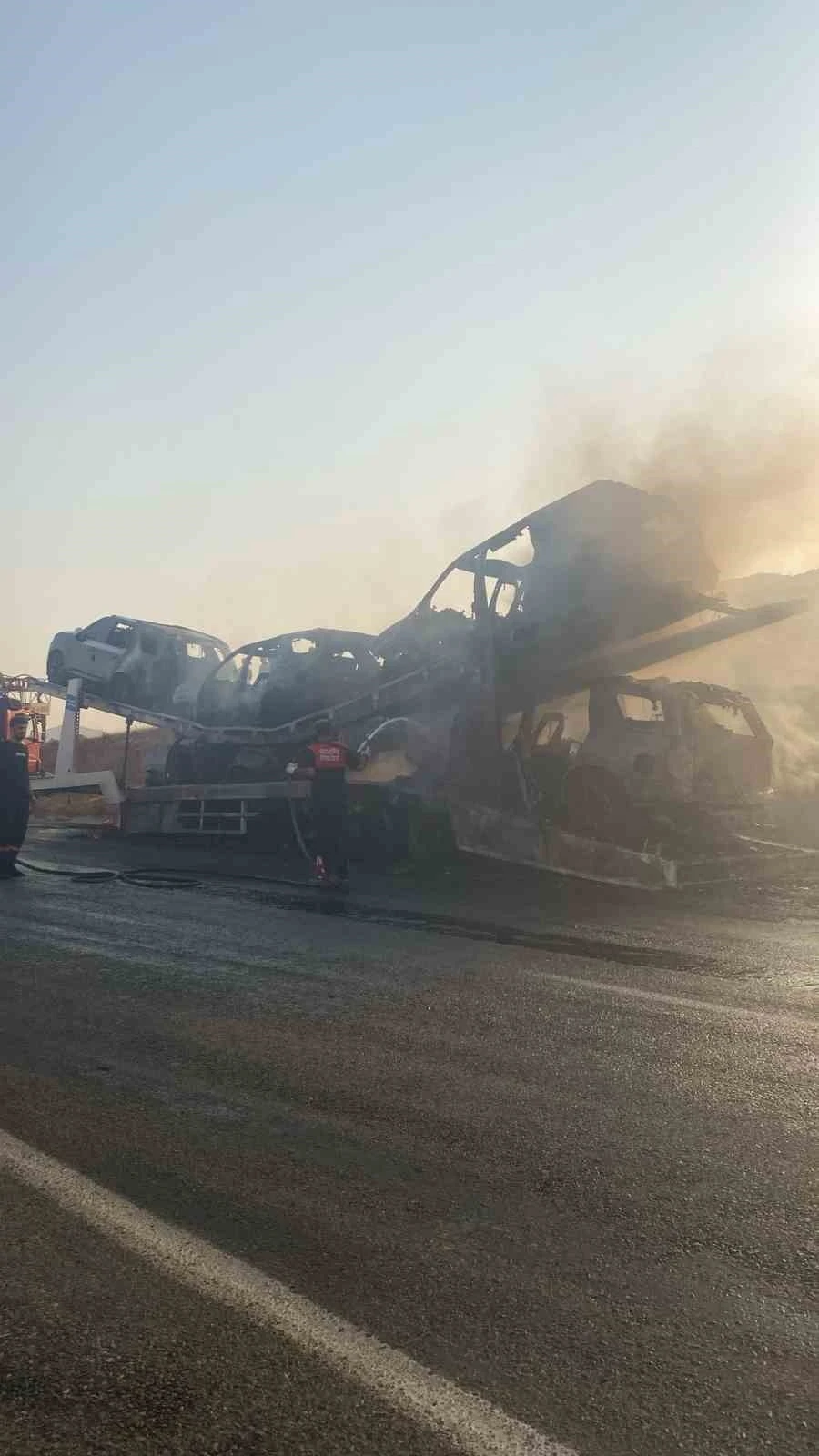 Batman’da İran plakalı tır ve üzerindeki sıfır kilometre 5 lüks araç, çıkan yangında hurdaya döndü.