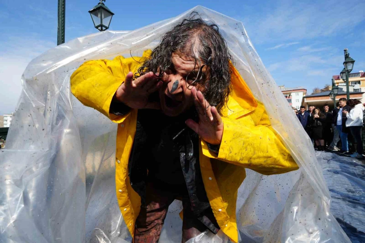 Etkinliğe ilgi gösteren öğrenciler ve vatandaşlar da performansa dahil oldu. Katılımcılar, kovalarla aldıkları suyu Kavukcu’nun üzerine dökerek eyleme destek verdi.