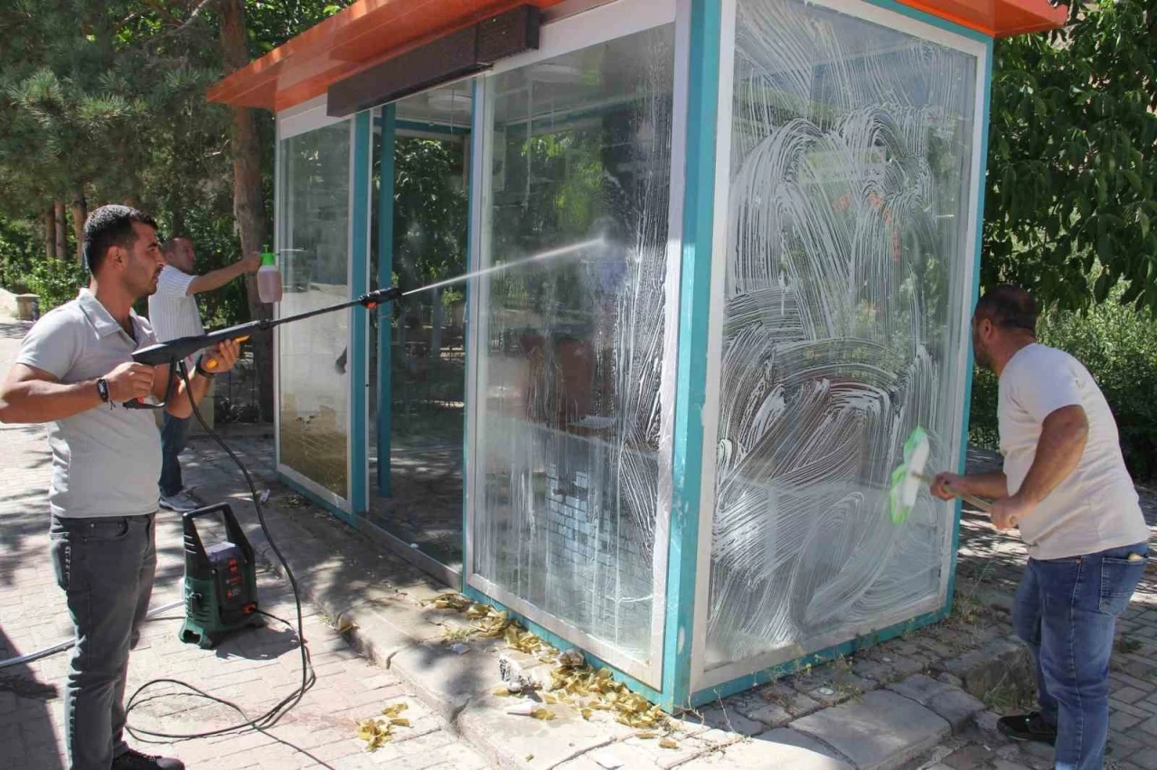 Durak camlarına rastgele yapıştırılan reklam afişleri ve ilanlar kazınarak kaldırıldı ardından cam yüzeyler özel temizlik solüsyonlarıyla yıkandı. İç kısımlarda ise zemin, oturma alanları ve duvarlar detaylı bir şekilde dezenfekte edildi.