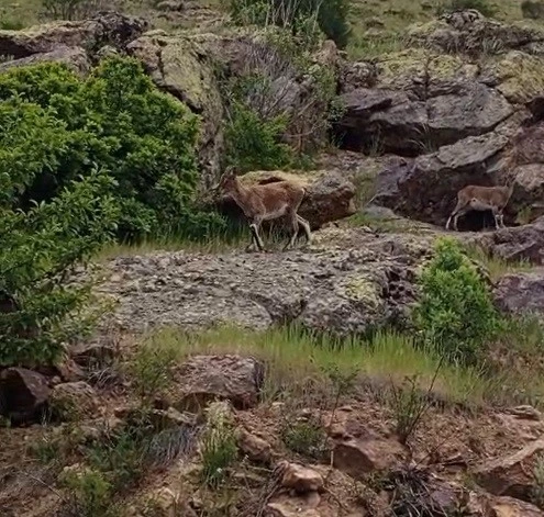 Bayburt’ta bir vatandaş, Üzengili köyü yakınlarında rastladığı dağ keçilerine uzaktan seslenerek, yol tarif etti. O anları kayda alan vatandaş, dağ yamacındaki keçileri "Aşağı inmeyin, düşersiniz" diyerek uyardı. Cep telefonu kamerasına yansıyan görüntüler, yüzlerde tebessüm oluşturdu.