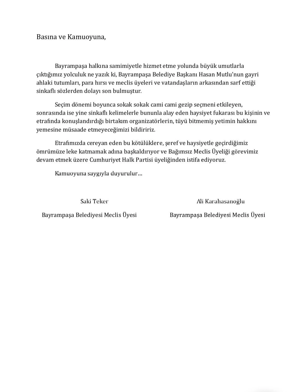 Sosyal medya hesaplarından CHP’den istifa ettiklerini açıklayan Bayrampaşa Belediye Meclisi Üyeleri Sadi Teker ve Ali Karahasanoğlu, Bayrampaşa Belediye Başkanı Hasan Mutlu’yu suçlayarak "gayri ahlaki tutumlar" sergilediğini ve kamuoyuna yönelik "sinkaflı sözler" kullandığını iddia etti. İki meclis üyesi yollarına bağımsız olarak devam edeceklerini açıkladı. Teker ve Karahasanoğlu; sosyal medyadaki açıklamalarında, "Bayrampaşa halkına samimiyetle hizmet etme yolunda büyük umutlarla çıktığımız yolculuk ne yazık ki Bayrampaşa Belediye Başkanı Hasan Mutlu’nun gayri ahlaki tutumları, para hırsı ve meclis üyeleri ve vatandaşların arkasından sarf ettiği sinkaflı sözlerden dolayı son bulmuştur. Seçim dönemi boyunca sokak sokak, cami cami gezip seçmeni etkileyen, sonrasında ise yine sinkaflı kelimelerle bununla alay eden haysiyet fukarası bu kişinin ve etrafında konuşlandırdığı birtakım organizatörlerin, tüyü bitmemiş yetimin hakkını yemesine müsaade etmeyeceğimizi bildiririz. Etrafımızda cereyan eden bu kötülüklere, şeref ve haysiyetle geçirdiğimiz ömrümüze leke katmamak adına başkaldırıyor ve bağımsız meclis üyeliği görevimiz devam etmek üzere Cumhuriyet Halk Partisi’nden istifa ediyoruz" ifadelerini kullandı.
