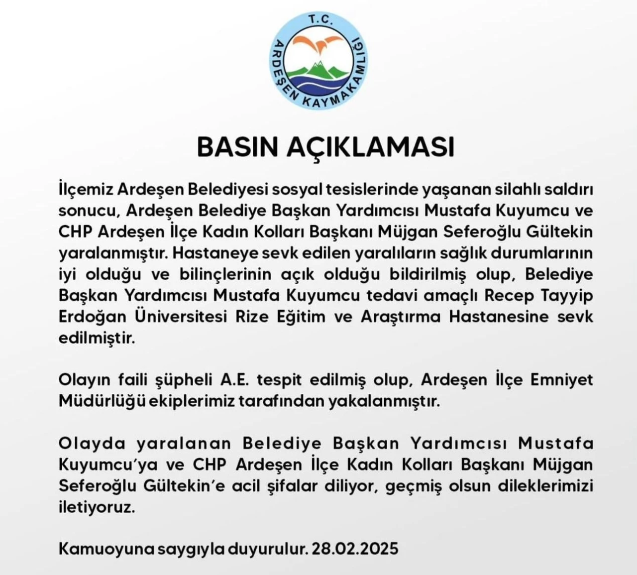 Ardeşen Kaymakamlığı tarafından açıklama yaparak olayın faili A.E.’ın gözaltına alındığı duyuruldu. Açıklamada, "Ardeşen Belediyesi sosyal tesislerinde yaşanan silahlı saldırı sonucu, Ardeşen Belediye Başkan Yardımcısı Mustafa Kuyumcu ve CHP Ardeşen İlçe Kadın Kolları Başkanı Müjgan Seferoğlu Gültekin yaralanmıştır. Hastaneye sevk edilen yaralıların sağlık durumlarının iyi olduğu ve bilinçlerinin açık olduğu bildirilmiş olup, Belediye Başkan Yardımcısı Mustafa Kuyumcu tedavi amaçlı Recep Tayyip Erdoğan Üniversitesi Rize Eğitim ve Araştırma Hastanesine sevk edilmiştir. Olayın faili şüpheli A.E. tespit edilmiş olup, Ardeşen İlçe Emniyet Müdürlüğü ekiplerimiz tarafından yakalanmıştır. Olayda yaralanan Belediye Başkan Yardımcısı Mustafa Kuyumcu’ya ve CHP Ardeşen İlçe Kadın Kolları Başkanı Müjgan Seferoğlu Gültekin’e acil şifalar diliyor, geçmiş olsun dileklerimizi iletiyoruz" ifadelerine yer verildi.