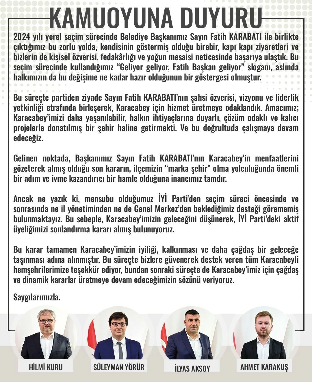 Karacabey Belediyesi İYİ Parti meclis üyeleri Hilmi Kuru, Süleyman Yörür, İlyas Aksoy ve Ahmet Karakuş, istifa kararının Karacabey Belediye Başkanı Fatih Karabatı’nın "marka şehir" vizyonuna destek olmak ve ilçenin menfaatlerini korumak amacıyla alındığını belirtti.