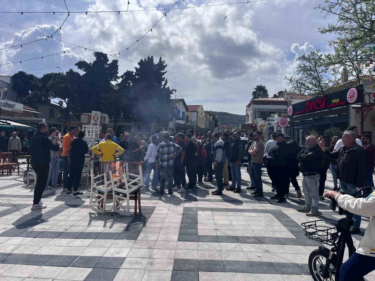 İzmir’in Foça ilçesinde zabıta ekipleri, esnafa ait masa ve sandalyeleri, kaldırımları ve yolları işgal ettiği gerekçesiyle topladı. Karara tepki gösteren esnaflar kepenk kapatarak masa ve sandalyeleri meydanda yaktı.