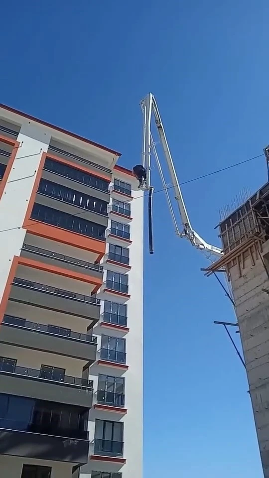 Olay, Elazığ’da inşaat halindeki bir binada meydana geldi. Edinilen bilgiye göre, devam eden bir inşaata harç götüren firma mikser ve pompa ile binaya beton atmaya başladı. Bu sırada ismi öğrenilmeyen bir işçi ise pompa hortumunun üzerine çıktı. Pompa yaklaşık 10 katlı binanın boyuna yükselirken, işçi adeta ölüme meydan okudu. İşçinin tehlikeli hareketi cep telefonu kamerasına yansıdı.