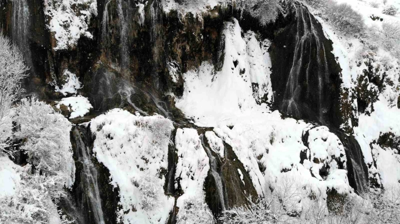 Erzincan’da doğal güzelliğiyle öne çıkan Girlevik Şelalesi, etkili olan kar yağışının ardından beyaza bürünerek kartpostallık görüntüler oluşturdu.