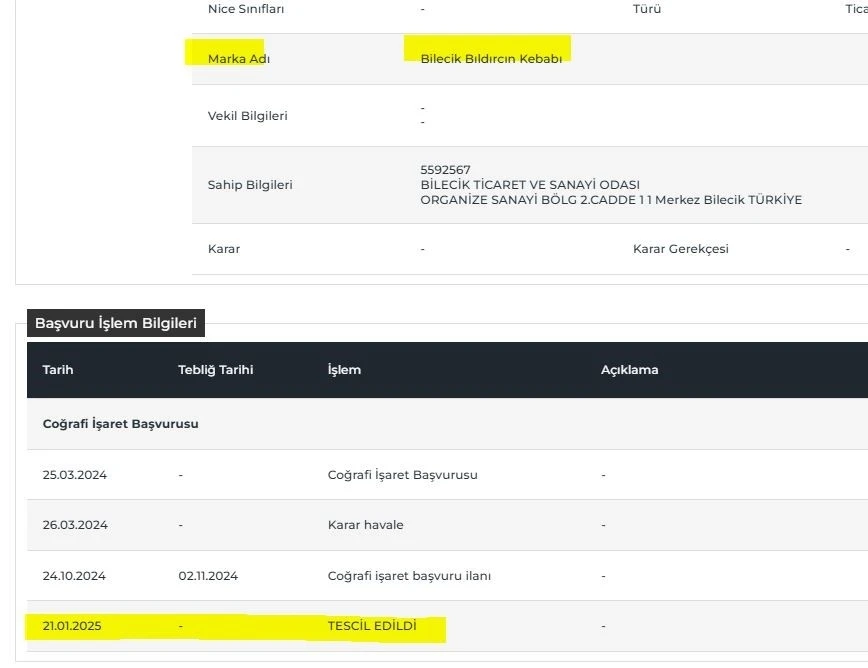 Bilecik’in en özel lezzetleri arasında yer alan Bıldırcın Kebabı, ilin coğrafi işaretli ürünleri arasına girdi. 25 Mart 2024 tarihinde Bıldırcın Kebabı için Türk Patent Kurumuna coğrafi işaret tescili yapılmıştı. Türk Patent Kurumu tarafından yapılan inceleme ve değerlendirmelerin ardından Bıldırcın Kebabı, 190 sayılı Resmi Coğrafi İşaret ve Geleneksel Ürün Adı Bülteni’nde tescil almaya hak kazanan ürünler arasında yerini aldı.