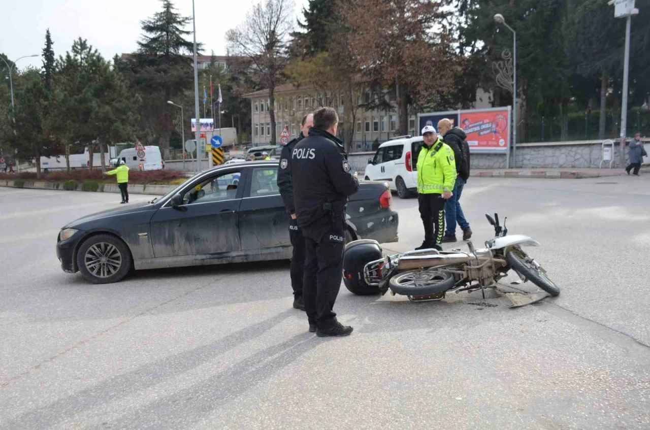 Kaza; Bilecik merkez Eski Otogar Kavşağı’nda meydana geldi. Alınan bilgilere göre; Bilecik merkez Atatürk Bulvarı’ndan seyir halindeki Şahin B. idaresindeki 32 FB 621 otomobil, kavşaktan dönüş yaptığı esnada aynı istikamette seyreden Resulü A. idaresindeki 63 AID 633 plakalı motosiklet çarptı. Yaşanan trafik kazasında motosiklet sürücüsü Resulü A. yaralandı. Yaralı olay yerine gelen 112 Acil Servis ekiplerince yapılan ilk müdahalenin ardından Bilecik Eğitim ve Araştırma Hastanesine kaldırıldı.