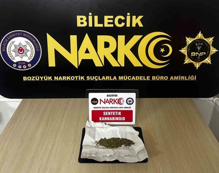 Bozüyük Narkotik Suçlarla Mücadele Büro Amirliği ekiplerince yakalanan şüphelinin üzerinde yapılan aramada; 6,32 gram sentetik kannabinoid (Bonzai) maddesi ele geçirildi. Şüpheli hakkında ‘Kullanmak İçin Uyuşturucu Madde Satın Almak, Kabul Etmek Veya Bulundurmak’ suçu kapsamında yasal işlem başlatıldı.