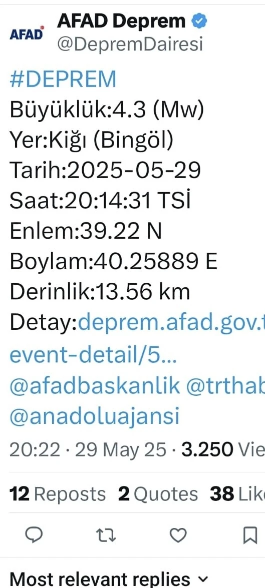 AFAD’dan yapılan açıklamaya göre, saat 20.14’te merkez üssü Bingöl’ün Kiğı ilçesinde 4,3 büyüklüğünde deprem meydana geldi. Yerin 13.56 kilometre derinliğinde meydana gelen depremde şimdiye kadar olumsuz bir duruma rastlanmadığı kaydedildi.