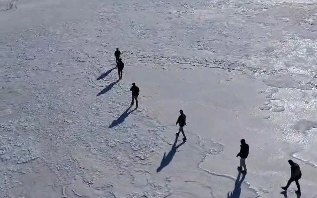 Bingöl’ün Karlıova ilçesine bağlı Hacılar köyünde bulunan Azizan Gölü, soğuk havanın etkisini artırmasıyla birlikte yaklaşık 30 santim kalınlığında buz tabakasıyla kaplandı. Gezginler, donan gölün üzerinde yürüyüş gerçekleştirdi.