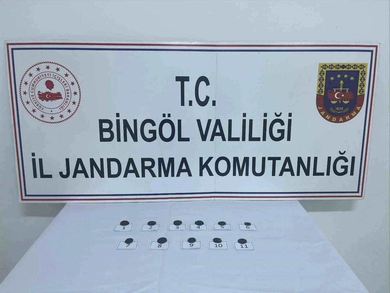 Bingöl’de durdurulan 2 şahsın üst aramasında bakır bronz karşımı olduğu değerlendirilen 11 sikke ele geçirildi.