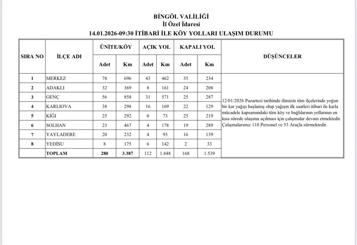 Yapılan çalışmalar neticesinde 112 köy yolu ulaşıma açılırken, halen kapalı durumda bulunan 168 köy yolunda kar küreme ve yol açma çalışmalarının devam ettiği bildirildi. Yetkililer, kapalı yolların da en kısa sürede ulaşıma açılmasının hedeflendiğini belirtti.