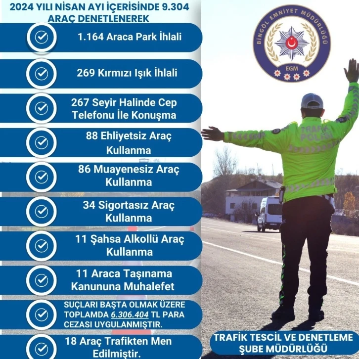 Bingöl İl Emniyet Müdürlüğü, nisan ayında yapılan trafik denetimlerinde araçlara toplamda 6 milyon 306 bin 404 lira idari para cezası kesildiğini belirtti.