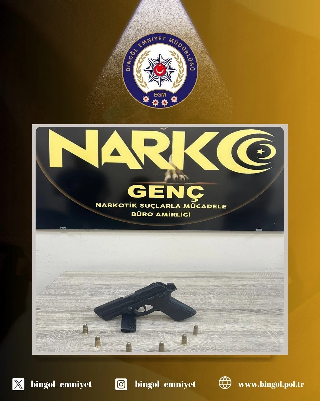Bingöl Narkotik Suçlarla Mücadele Şube Müdürlüğüne bağlı Genç Büro Amirliği ekiplerince uygulama esnasında şüphelenilen 1 şahıs üzerinde 1 adet ruhsatsız tabanca, 1 adet şarjör ve şarjörü basılı 6 adet fişek ele geçirildi. Şahıs hakkında işlem başlatıldı.