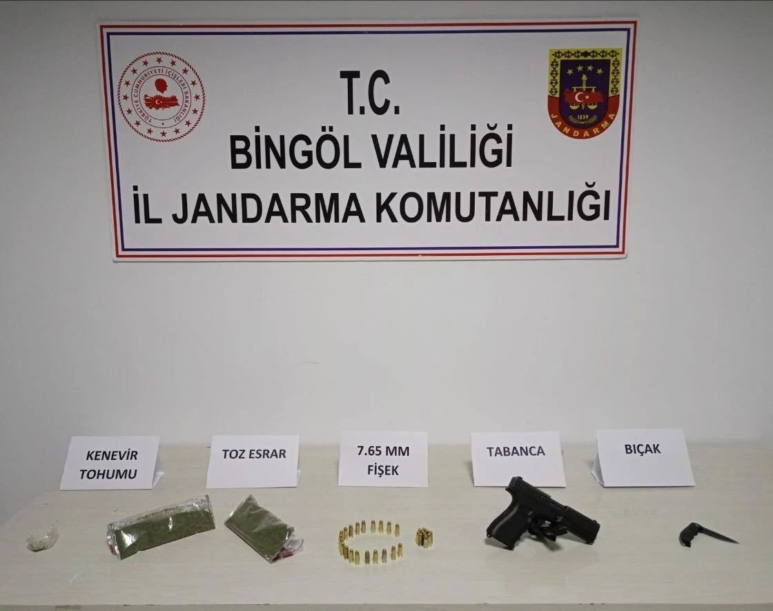 Bingöl İl Jandarma Komutanlığı unsurlarınca, 30 Kasım - 2 Aralık arasında aranan şahısların yakalanması ve uyuşturucu madde imal ve ticaretinin önlenmesine yönelik çalışma gerçekleştirildi. Yapılan çalışmalar neticesinde 7 kilo 548 gram toz esrar, 135 gram kubar esrar 2 adet ruhsatsız tabanca 52 adet fişek ele geçirildi. Ayrıca, ‘birden fazla kişi tarafından silahla yağma’, ‘hakaret ve görevi yaptırmama’ suçu ile ‘uyuşturucu kullanmak ve bulundurmak’ suçundan arama kaydı bulunan 3 şüpheli şahıs yakalandı. Şahıslar çıkarıldıkları adli makamlarca ifadelerinin alınmasının ardından serbest bırakıldı.