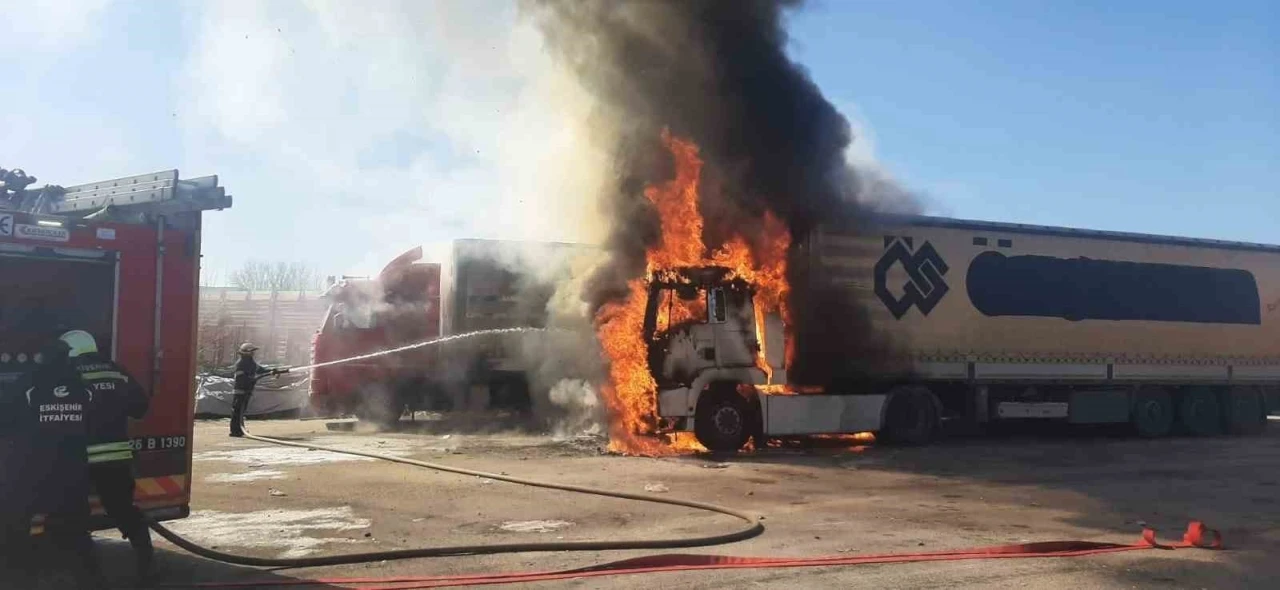 Eskişehir’de 3 tırın ortasında bulunan bir tırda çıkan ve kısa sürede 2 tıra daha sıçrayan yangın itfaiye ekiplerinin müdahalesiyle kontrol altına alındı.
