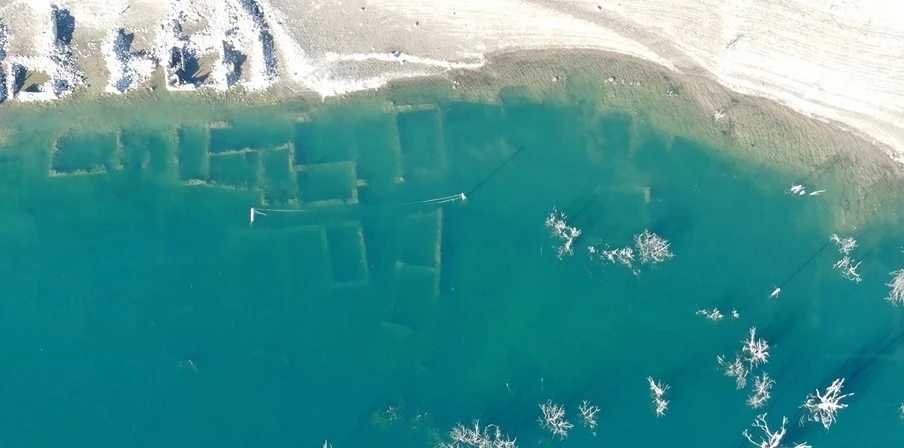 Sivas’ta kuraklık nedeniyle Pusat Barajı’nın suyu çekildi. Suyun azalmasıyla ortaya çıkan eski Pusat köyü, yıllar sonra kar altında kaldı.