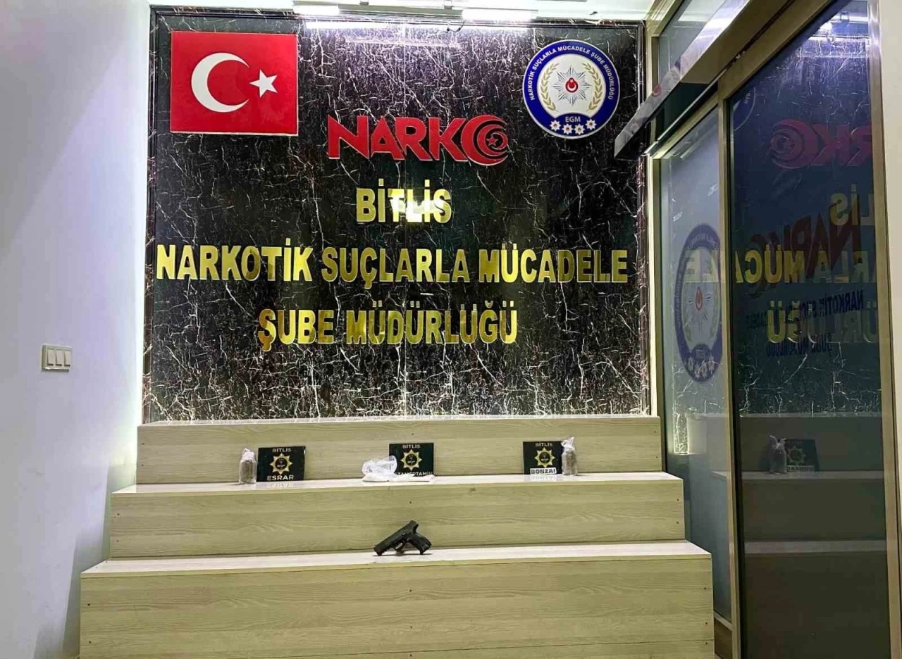 Bitlis Valiliğinden yapılan açıklamada; Bitlis Cumhuriyet Başsavcılığı, Bitlis Emniyet Müdürlüğü Narkotik Suçlarla Mücadele Şube Müdürlüğü ve İstihbarat Şube Müdürlüğü koordinesinde uyuşturucu madde satıcılarına yönelik planlı dosya kapsamında çalışması yapıldığı belirtildi. Açıklamada, "Bitlis merkezli 8 adrese yönelik özel harekât timleri destekli şafak vakti yapılan eş zamanlı operasyon neticesinde 8 şüpheli yakalanmış, yakalanan şüpheliler çıkarıldıkları adli mercilerce tutuklanarak cezaevine gönderilmiştir. Bahse konu şüpheli şahısların ikametlerinde, üzerlerinde ve araçlarında yapılan aramalarda, 178 gram metamfetamin maddesi, 113 gram bonzai maddesi, satışa hazır vaziyette 18 parça halinde metamfetamin maddesi, satışa hazır vaziyette 23 parça halinde bonzai maddesi, 8,70 gram bonzai ham maddesi, 218 kullanımlık sentetik kannobinoid maddesi, 1 adet tabanca ve 35 adet fişek ele geçirilmiştir. Hemşehrilerimizin huzuru ve güvenliği için uyuşturucu madde imalatı, kaçakçılığı ve kullanımına karşı yürütülen kararlı mücadelemiz devam edecektir" denildi.