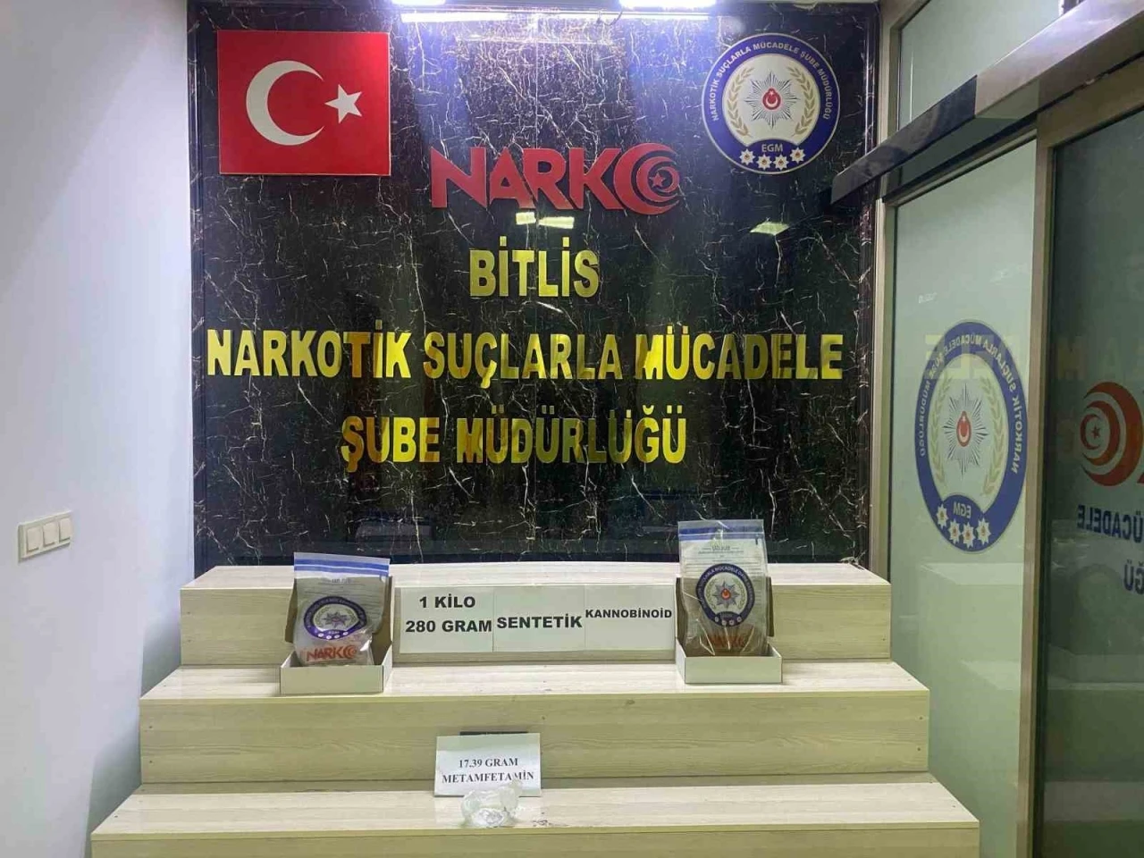 Bitlis Valiliğinden yapılan açıklamada, Bitlis Emniyet Müdürlüğü Narkotik Suçlarla Mücadele Şube Müdürlüğü, İstihbarat Şube Müdürlüğü ve Ahlat İlçe Emniyet Müdürlüğünce Ahlat ve Tatvan Cumhuriyet Başsavcılıkları koordinesinde, uyuşturucu madde imal ve ticareti yapan şahıslara yönelik çalışması yapılan planlı dosya kapsamında Bitlis merkezli Ahlat ve Hizan ilçeleri olmak üzere 3 adrese operasyon düzenlendiği belirtildi. Açıklamada, "Özel harekât timleri destekli yapılan eş zamanlı operasyonda 2 kişi gözaltına alındı. Gözaltına alınan şahsılar, emniyetteki işlemlerinin ardından sevk edildikleri mahkemece tutuklandı. Ayrıca, dosya kapsamında 14 şüpheli şahıs hakkında uyuşturucu madde bulundurmak ve kullanmak suçundan adli işlem yapıldı. Şüpheli şahısların ikametlerinde, üzerlerinde ve araçlarında yapılan aramalarda 1 kilo 280 gram sentetik kannobinoid maddesi, 3 kilogram sıvı sentetik kannobinoid ham maddesi, 770 kullanımlık peçeteye emdirilmiş uyuşturucu madde, 17,39 gram metamfetamin maddesi ele geçirildi" denildi.