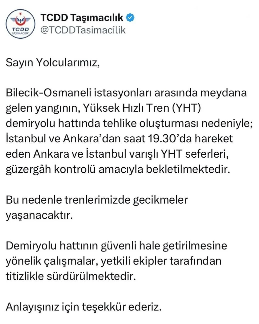 TCDD Taşımacılık tarafından yapılan açıklamada, "Bilecik-Osmaneli istasyonları arasında meydana gelen yangının Yüksek Hızlı Tren (YHT) demiryolu hattında tehlike oluşturması nedeniyle İstanbul ve Ankara’dan saat 19.30’da hareket eden Ankara ve İstanbul varışlı YHT seferleri, güzergâh kontrolü amacıyla bekletilmektedir. Bu nedenle trenlerimizde gecikmeler yaşanacaktır. Demiryolu hattının güvenli hale getirilmesine yönelik çalışmalar, yetkili ekipler tarafından titizlikle sürdürülmektedir" denildi.