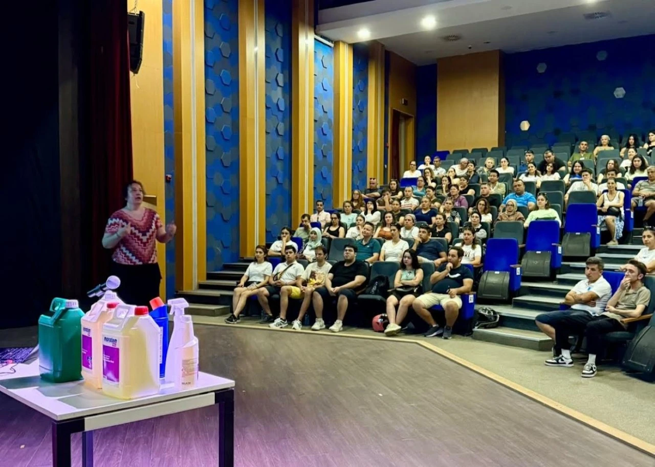 Maratem firması iş birliğiyle 13 Haziran Cuma günü iki oturum halinde gerçekleştirilen eğitimde; temizlik kimyasallarının doğru ve güvenli kullanımı, uygulama teknikleri, alan bazlı ürün seçimi ve olası risk durumlarında alınması gereken önlemler gibi başlıklar ele alındı.