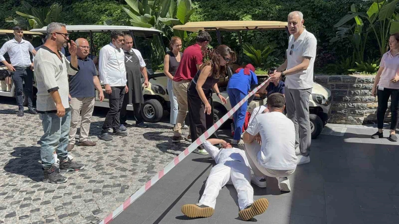 Sisler içinde başlayan tatbikat, yerli ve yabancı turistler tarafından ilgiyle izlenirken, otel personelinin yangına müdahalesi nefesleri kesti. Bodrum’da bulunan The Oba Otel’de senaryo gereği resepsiyon bölümünde çıkan yangına ilk müdahaleyi otelin yangın timi yaptı. Otel personeli, yangın tüpleriyle alevlere müdahale ederken, gerçekçiliği artırmak amacıyla yoğun duman kullanıldı. Tatbikat kapsamında 2 personel yaralandı. Olay yerine gelen ilk yardım ekipleri, yaralı personele müdahale etti.