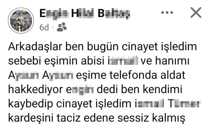 Öte yandan, zanlı Engin B.’nin, cinayetin ardından sosyal medya hesabından paylaşım yaptığı belirlendi. Engin B.’nin, paylaşımında, "Arkadaşlar ben bugün cinayet işledim. Sebebi, eşimin abisi İ. ve hanımı A. eşime telefonda ’Aldat, hak ediyor Engin’ dedi. Ben kendimi kaybedip cinayet işledim. İ.T., kardeşini taciz edene sessiz kalmış" ifadelerini kullandığı görüldü.