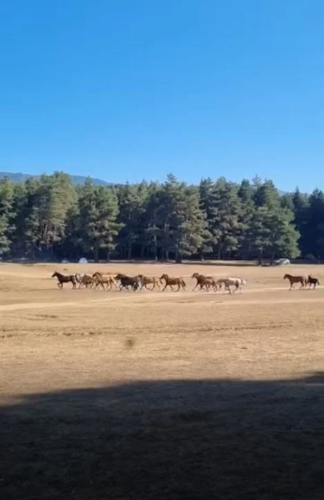 Bolu’da At Yaylası’nda otlayan yılkı atı sürüsüne, ormanlık alandan inen kurt saldırdı. Saldırı üzerine panikle kaçışan atları fark eden çevredeki vatandaşlar ses çıkararak kurdu korkuttu. İnsanların müdahalesiyle atlardan uzaklaşan kurt, ormanlık alana dönerek gözden kayboldu. Yılkı atlarının panik anları ve kurdun saldırısı, vatandaş tarafından cep telefonu kamerasıyla kaydedildi.
