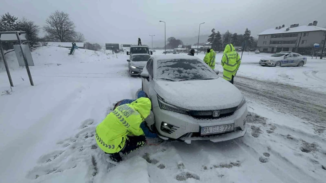D-100 karayolunun Bolu Dağı geçişinde yoğun kar yağışı sebebiyle sürücüler zor anlar yaşıyor. Bölge trafik polisi ekipleri kış lastiği olmayan sürücülere geçiş izni vermiyor.