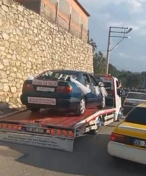 Denizli’de düğün konvoyunda arızalanan gelin arabasının yardımına yoldan geçen çekici yetişti. Gelin ve damadın içerisinde bulunduğu araç konvoya çekici ile devam etti.