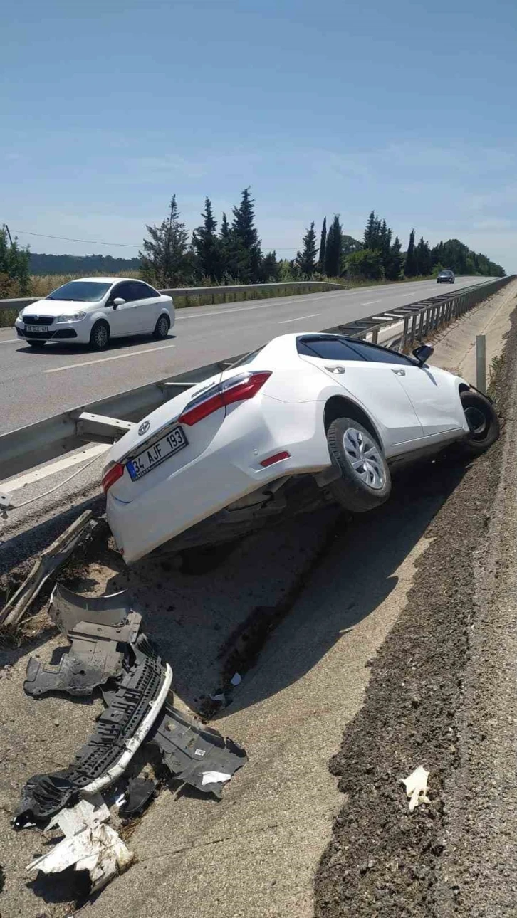 Bursa-Balıkesir karayolunda sürücüsünün direksiyon hakimiyetini kaybettiği otomobil refüje çarptı. Kazada 2 kişi yaralandı.