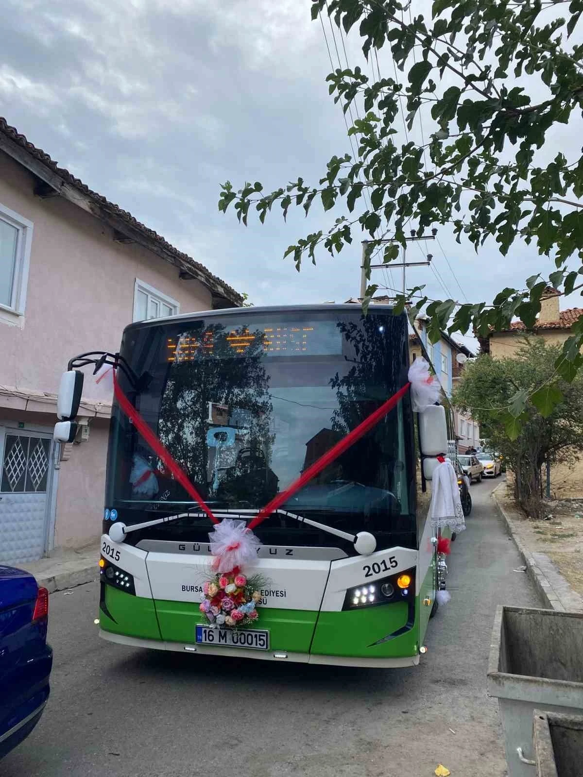 Bursa’nın Orhaneli ilçesinde evlenen Safa ve Buse çiftinin düğün konvoyunda şehir içi hatta çalışan özel halk otobüsü balon ve kurdelelerle süslenerek gelin arabası gibi korteje katıldı. Renkli görüntüler konukların cep telefonlarına yansıdı.
