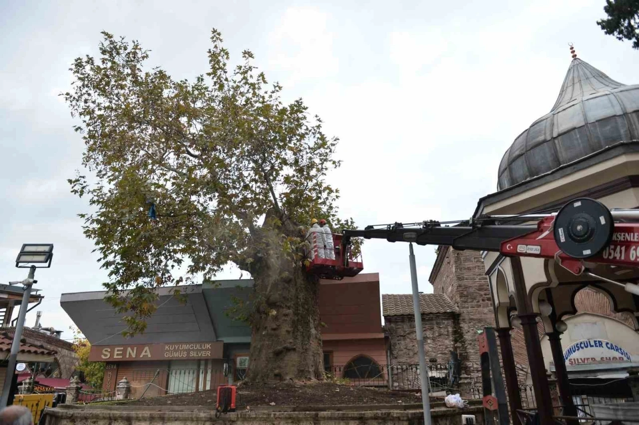 Bursa Ulu Cami’nin avlusunda yer alan ve henüz bilinmeyen bir nedenle büyük dalı kopan 346 yaşındaki asırlık çınar ağacı, Büyükşehir Belediyesi ekiplerinin bakım ve restorasyon çalışmalarıyla geleceğe taşınıyor.