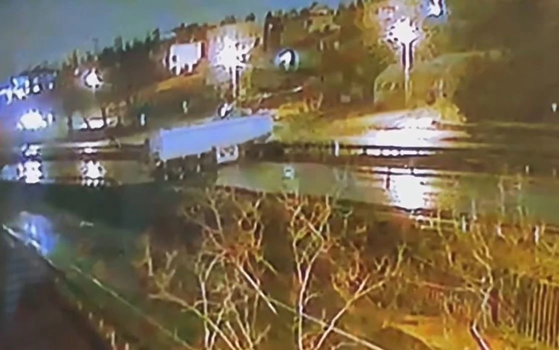 İstanbul Büyükçekmece’de yağmurda kayganlaşan yolda kayan tır bariyere çarparak ters döndü. O anlar güvenlik kamerasınca kaydedildi.