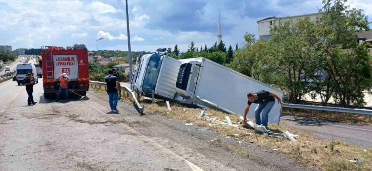 İstanbul (İHA) Büyükçekmece’de yağmur nedeniyle kayganlaşan yolda sürücüsünün direksiyon hakimiyetini kaybettiği kamyon devrildi. Sürücü kazada hafif şekilde yaralandı.